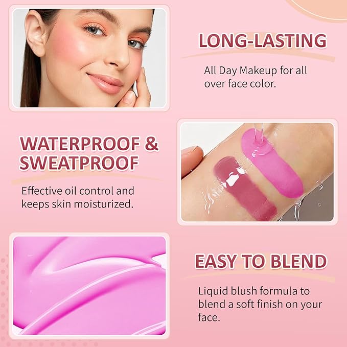 - Long-lasting & Waterproof: Liquid blush has a hydrating and lightweight texture that blends easily, leaving a long-lasting, smudge-proof color on the cheeks. Waterproof, sweatproof and smudge-proof, the blendable formula easily creates a flawless, healthy flush, makeing blush makeup last all day without fading
