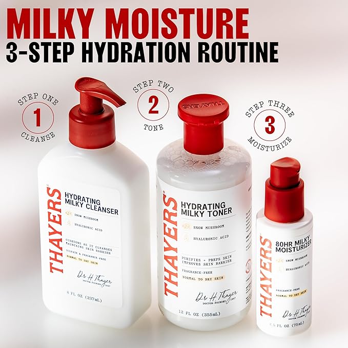 - Hydrating Milky Routine: After cleansing and toning with Thayers Milky Cleanser and Toner, apply 2-3 pumps of facial moisturizer onto face and neck until evenly absorbed. Use morning and night
