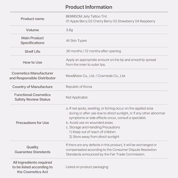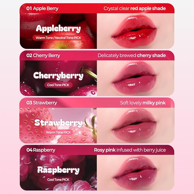 Berrisom Jelly Tattoo Tint, Long Lasting Korean Lip Stain with Jelly Texture, Transfer-Resistant Color, 3.8g / 0.13oz, 4 Shades (Appleberry)