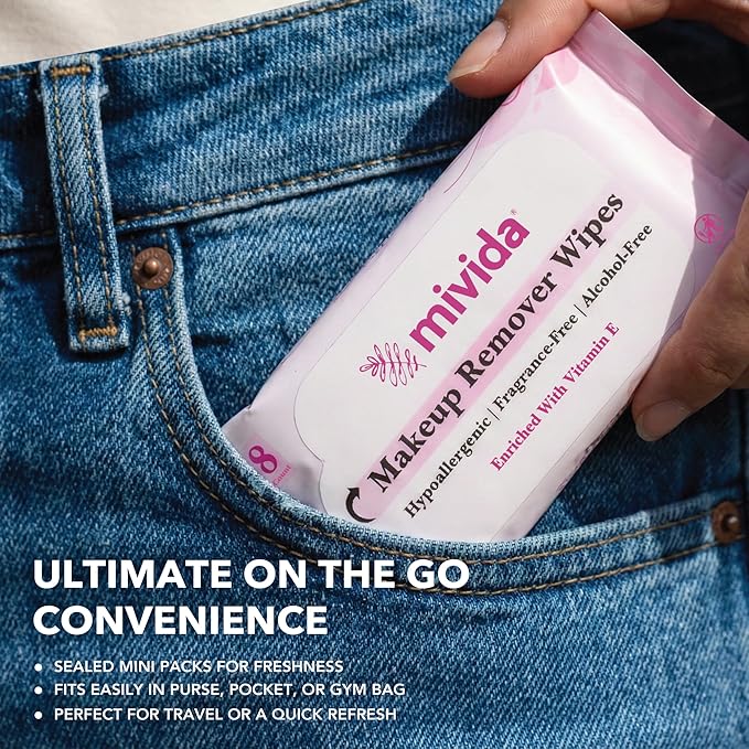 mivida Compact Travel Makeup Remover Wipes with Vit E, Hypoallergenic & Fragrance Free Makeup Wipes, Tough on Makeup Gentle on Skin. Travel Essentials for Adults & Teens, 10Bagsx8Wipes-80 Count