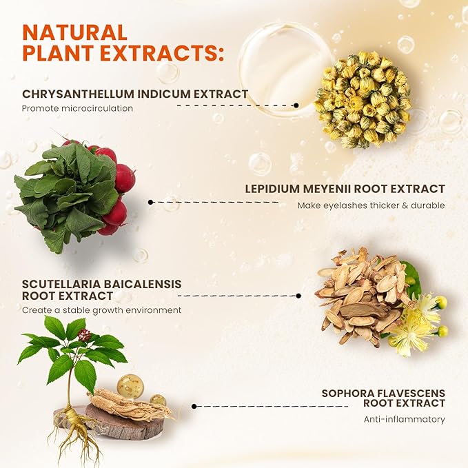 - Power of Natural Plant Extracts: We harness the power of nature through various plant extracts. These key natural ingredients work synergistically to support the lash growth cycle and improve micro-circulation for healthier-looking lashes, all while being gentle on the delicate eye area.