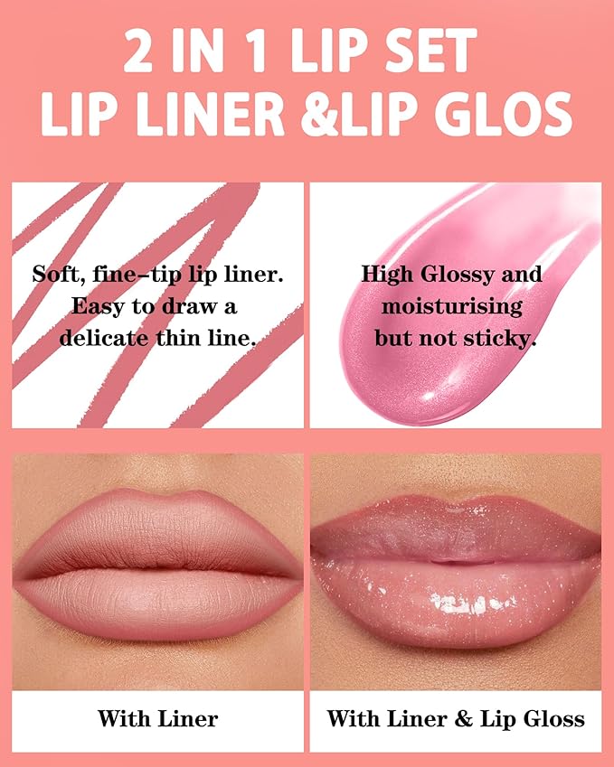 Matte Nude Pink Lip Liner Lipstick&Hydrating Glitter Lip Oil Combo Set,Moisturizing Plumping Lips Gloss&Smooth Lipliner Liquid Lipstick Long Lasting,2 in 1 Women Tinted Liptint Stain Balm Makeup-01